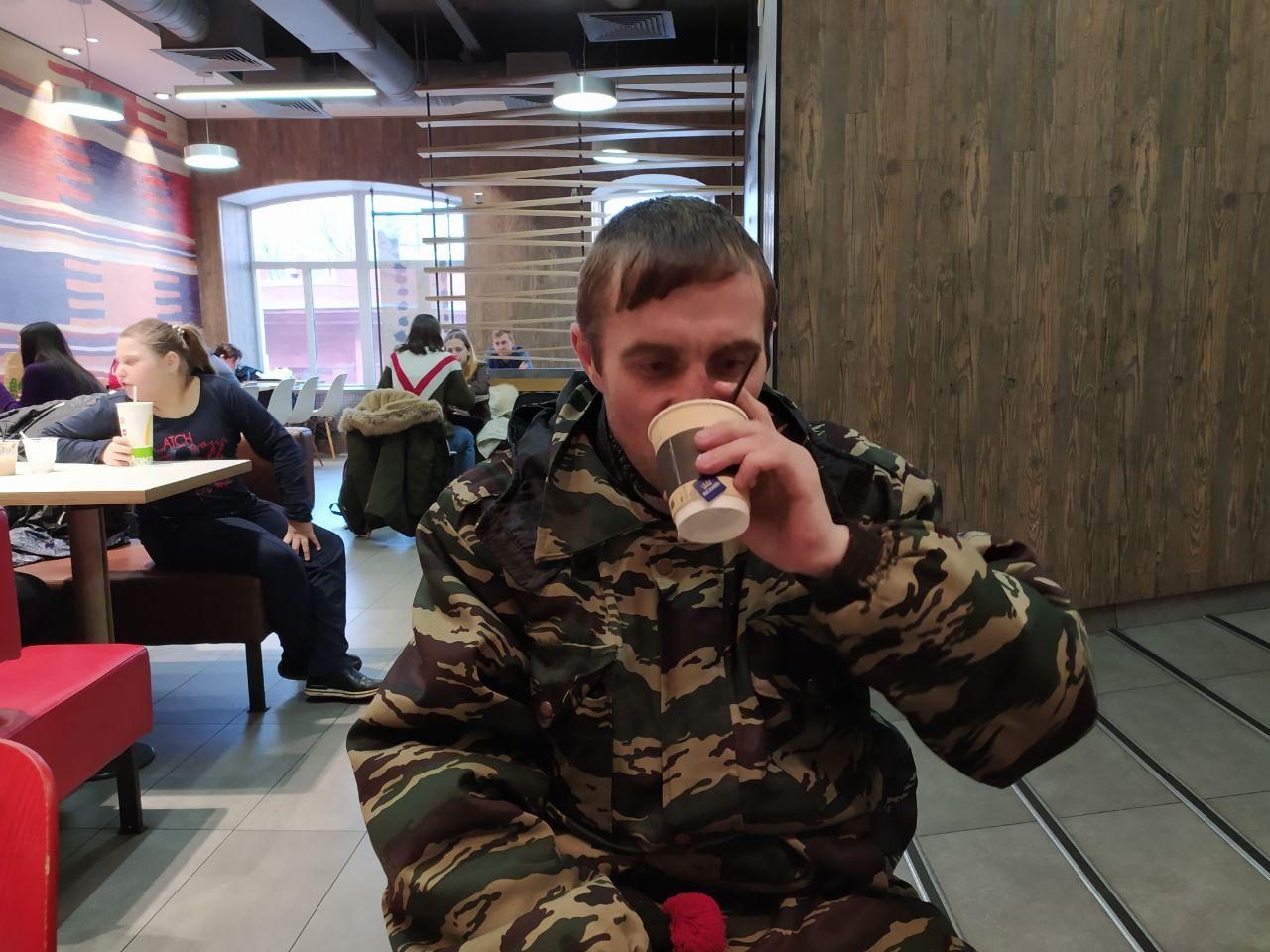 Заходим с Андреем в «Макдоналдс», обсудить, что он будет делать теперь, когда он уже прибыл в Москву. Вариант встать на Красной площади с плакатом про Кузбасс в одиночный пикет он отвергает.