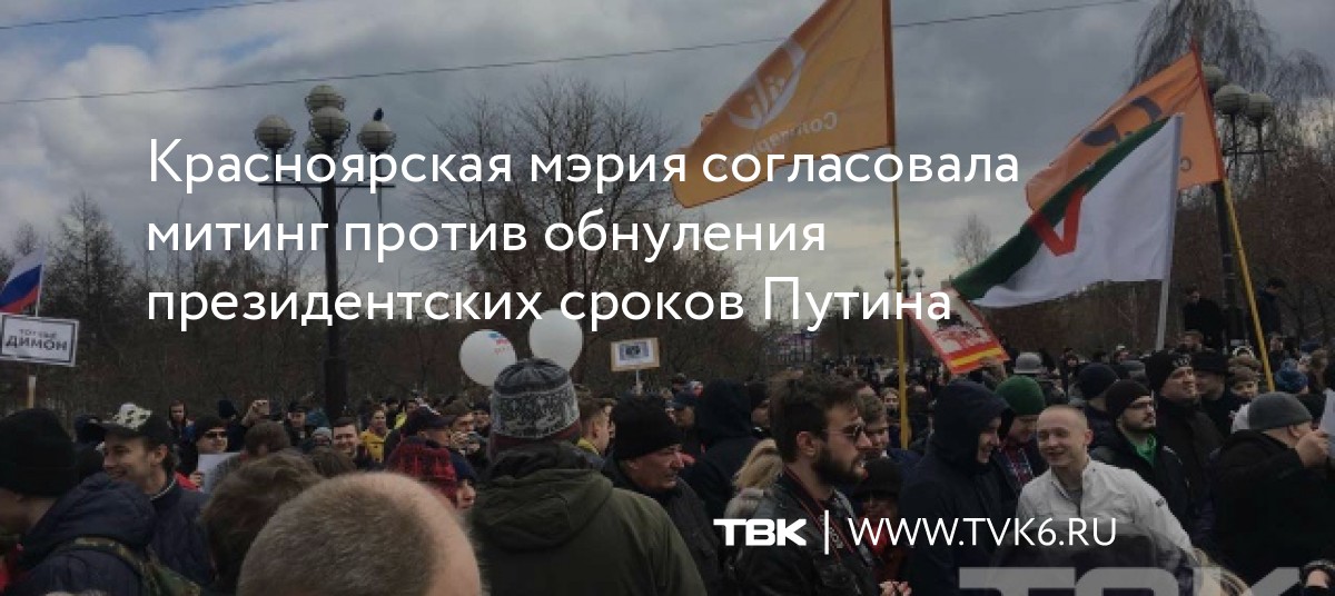 В Красноярске пройдет митинг против обнуления президентских сроков Владимира путина. Акция состоится 22 марта в 11:00 в сквере Космонавтов. Мэрия согласовала проведение митинга.