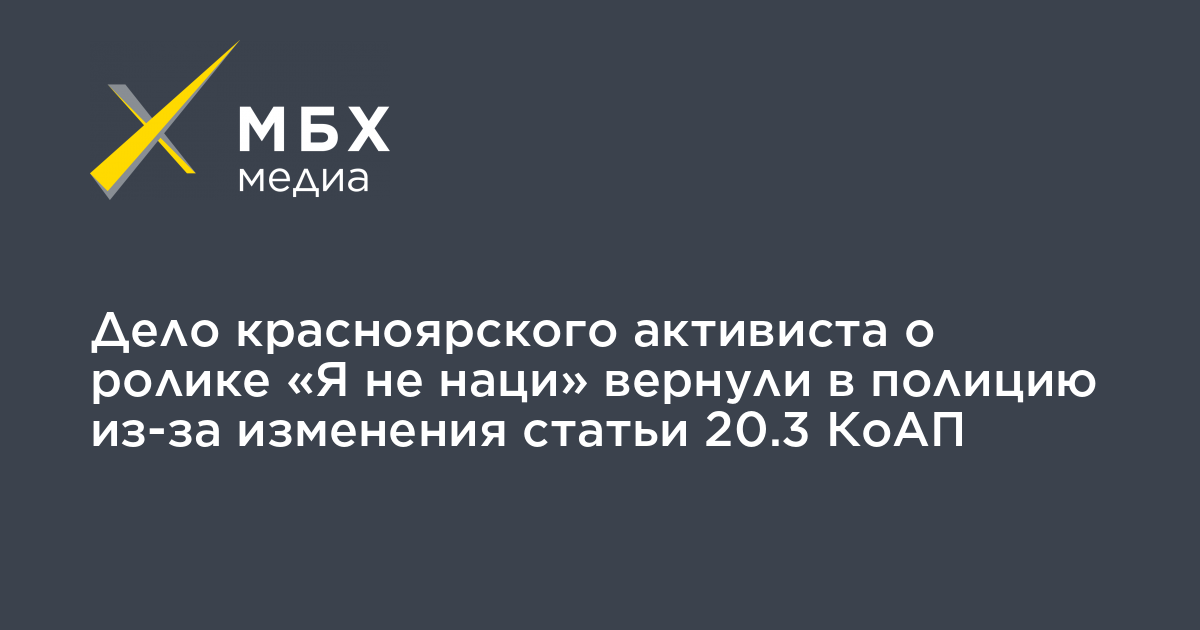 Дело о демонстрации нацистской символики (статья 20.3 КоАП), заведенное на красноярского активиста Глеба Марьясова из-за сатирического ролика «Я не наци», отправили обратно в полицию на доработку . Об этом активист рассказал «МБХ медиа».