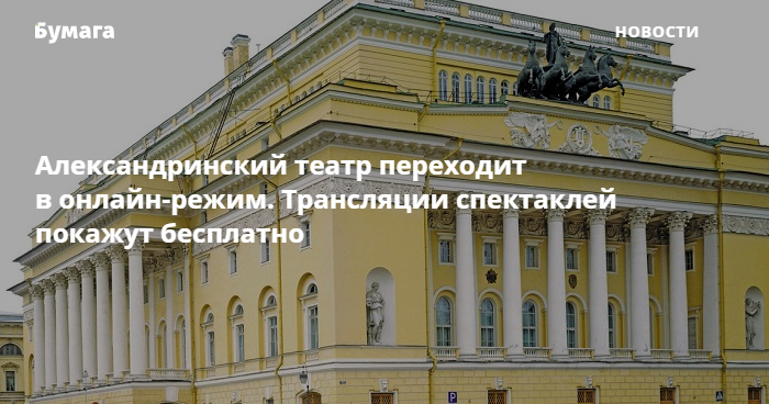Александринский театр, закрывшийся для посетителей из-за распространения коронавируса, покажет спектакли онлайн. Об этом на пресс-конференции сообщил главный режиссер театра Николай Рощин.