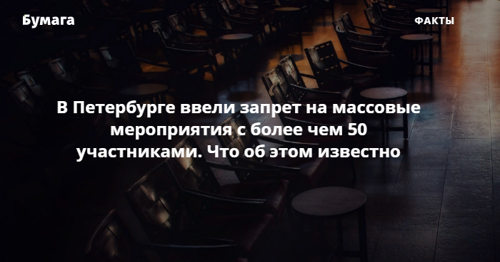 Власти Петербурга запретили проводить массовые мероприятия, рассчитанные более чем на 50 человек, из-за коронавируса. Ограничения будут действовать до 30 апреля. «Бумага» рассказывает, что известно о ситуации.