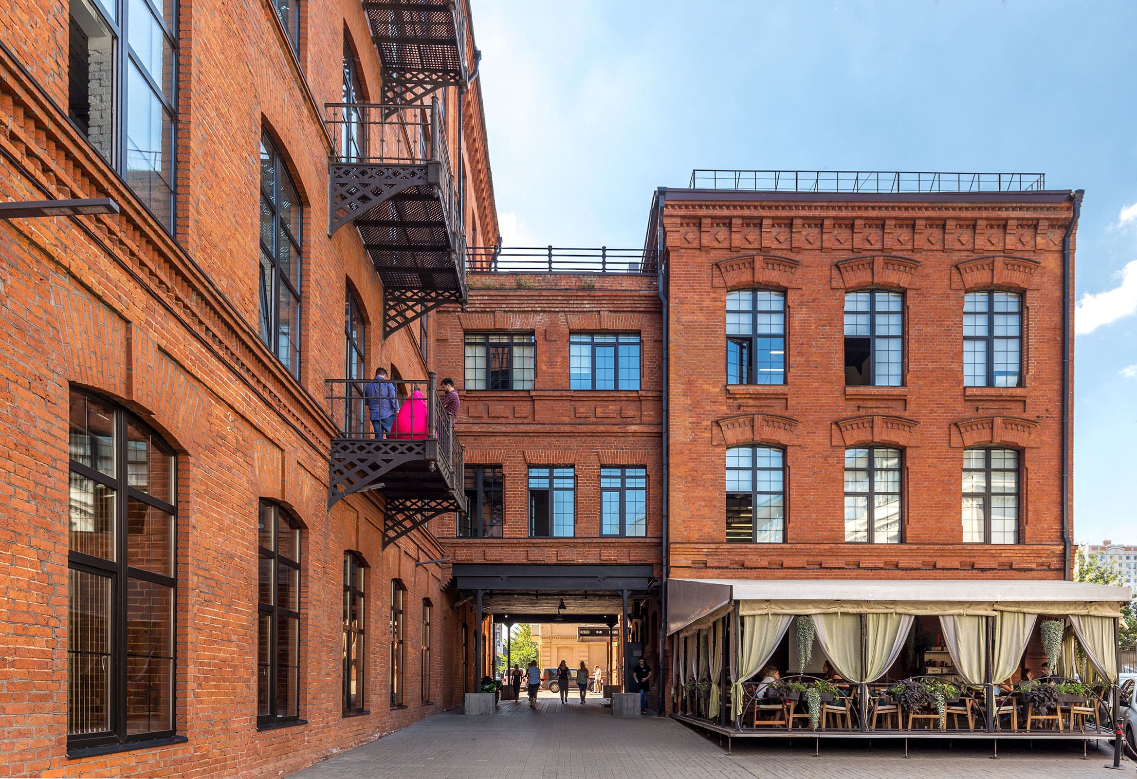 Вокруг — одни единомышленники: Сбербанк, «Эхо Москвы», «Афиша», Lenta.ru и «Газета.ру». А среди инфраструктуры не только стандартные рестораны, кафе и столовые для бизнес-ланчей, но и нотариус, химчистка, салон красоты, фитнес-студия и банк. За панорамными окнами — вид на исторические места Москвы и Москву-реку.