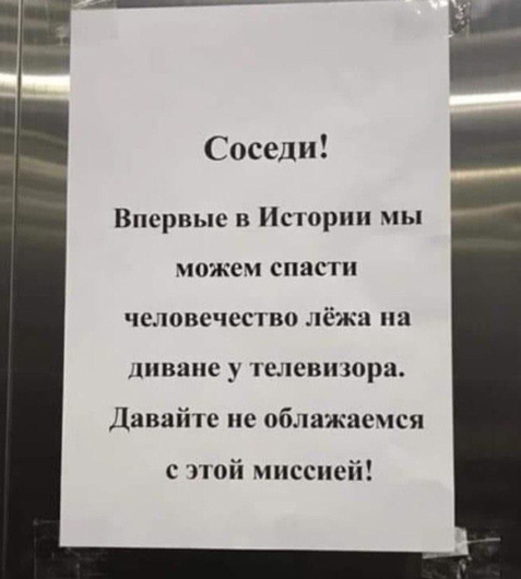Немалая часть городского населения — как в России, так и в Европе, — кажется, закрылась в своих квартирах с похожими лозунгами. Наконец-то сбылись обещания с магнитов на холодильники: «Хочешь изменить мир — начни с себя». «Планета загоняет нас по домам, чтоб мы навели в них порядок: начиная со своей комнаты, продолжая своими мыслями», — объясняет читателю «эксперт осознанных путешествий» Мария Степаненко. Наделенная разумной волей природа приказывает нам, по ее мнению, вымыть руки и проветрить шкаф.