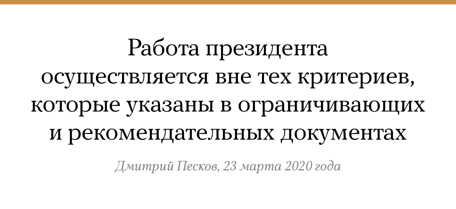 Рекомендации мэра Москвы о самоизоляции для граждан старше 65 лет не распространяются на президента России, заявил в беседе с журналистами пресс-секретарь главы государства Дмитрий Песков. Ранее Сергей Собянин в связи с угрозой распространения коронавируса обязал пожилых жителей Москвы соблюдать домашний режим и не посещать общественные места. В указе Собянина сделано исключение для руководителей и сотрудников, чье нахождение на работе «жизненно важно» для функционирования предприятий и органов государственной власти.