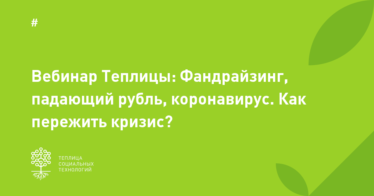 Теплица социальных технологий приглашает на вебинар по антикризисному фандрайзингу. О том, как сейчас подготовиться к затяжному кризису и разработать «продукт» на перспективу, расскажет директор по развитию и привлечению средств благотворительного фонда «Арифметика добра» Анастасия Ложкина.
