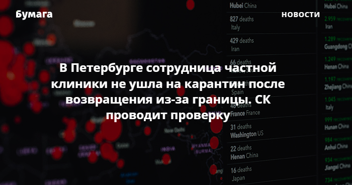 В Петербурге проводится доследственная проверка в отношении врача одной из частных медицинских клиник города, которая вернулась из-за границы, но не ушла на 14 дней на карантин. Об этом сообщает пресс-служба городского управления СК РФ.