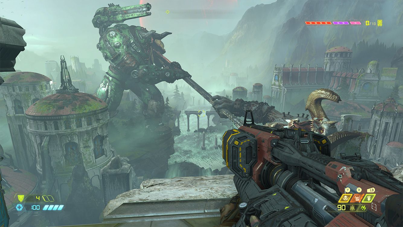 Без двойного прыжка и уклонения в Doom Eternal тоже никуда, особенно на поздних уровнях. Кроме способностей стоит изучить и доступное оружие. Как и чем оно стреляет, что у него за дополнительные режимы. Например, после прокачки боевого дробовика из него можно будет стрелять очередями. Пулемет с помощью модификаций можно превратить в мобильную турель. Совершенно точно нужно освоить крюк, идущий в комплекте с супердробовиком, — с ним можно в буквальном смысле порхать по уровню от врага к врагу. А еще гранаты! Одни осколочные, другие замораживают. К тому же оружие нужно постоянно менять. Во-первых, патроны быстро заканчиваются. Во-вторых, некоторые типы противников, допустим, демонов с щитами, проще всего убить из стволов определенного типа, а именно — плазменного ружья.
