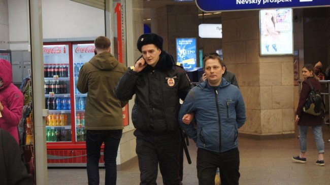 Полицейские повалили активиста на землю, причины задержания неизвестны. Его отвели в пункт полиции на станции метро Гостиный двор.