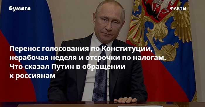 Президент Владимир Путин 25 марта выступил с обращением к россиянам из-за ситуации с коронавирусом. В нем он сделал сразу несколько важных объявлений: голосование по поправкам в Конституцию перенесут, первые дни апреля станут выходными, бизнесу могут дать отсрочку по налогам, а социальные пособия продлят. «Бумага» собрала главное из речи Путина.