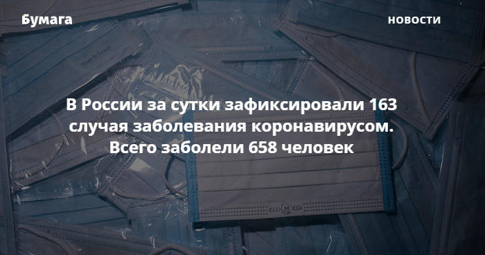 В России за сутки зафиксировали 163 новых случая заболевания коронавирусом. Общее число заразившихся достигло 658. Об этом пишет «РИА Новости» со ссылкой на зампреда правительства Татьяну Голикову.