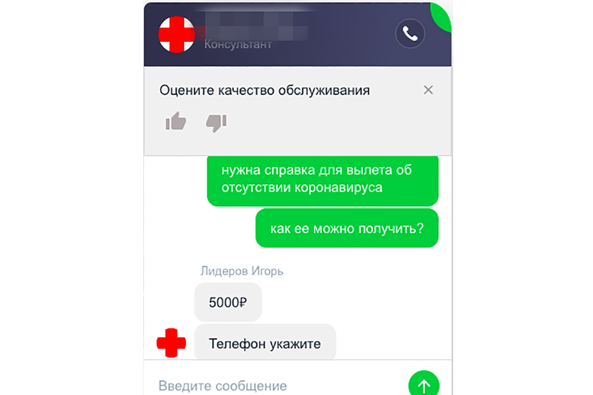 Убедившись, что моя врачебная тайна будет соблюдена, я написала онлайн-консультанту с вопросом, могу ли я приобрести у них справку об отсутствии коронавируса. «5000₽. Укажите телефон» – мгновенно ответил консультант.