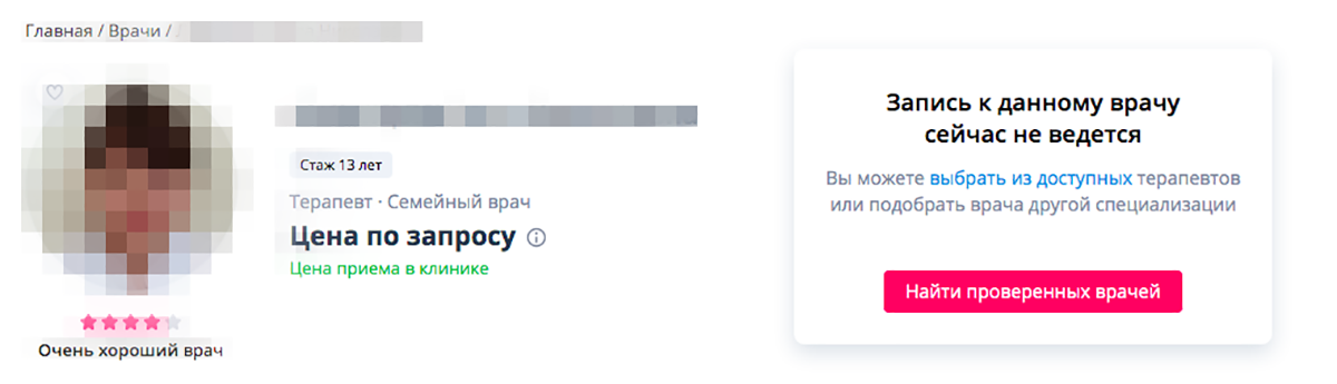 На сайте поликлиники врач, фамилия которой стоит на печати, числится в списке специалистов пятого терапевтического отделения. На сервисе записи к специалистам частных клиник Docdoc у указанного врача стоит четыре звезды из пяти и оценка «очень хороший врач».