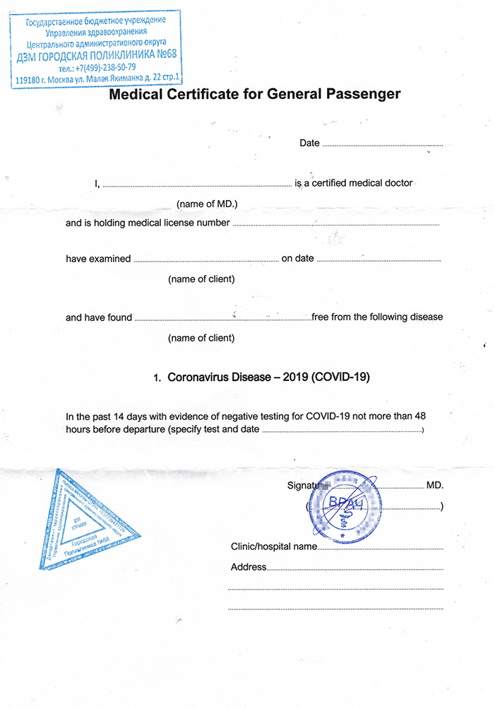Справка оказалась, как мне и обещали, бланком на английском с печатями и подписью врача. И сами печати, и фамилия врача на печати относятся к 68-ой московской городской поликлинике. В пустые поля я могу вписать любые личные данные и дату тестирования на коронавирус.