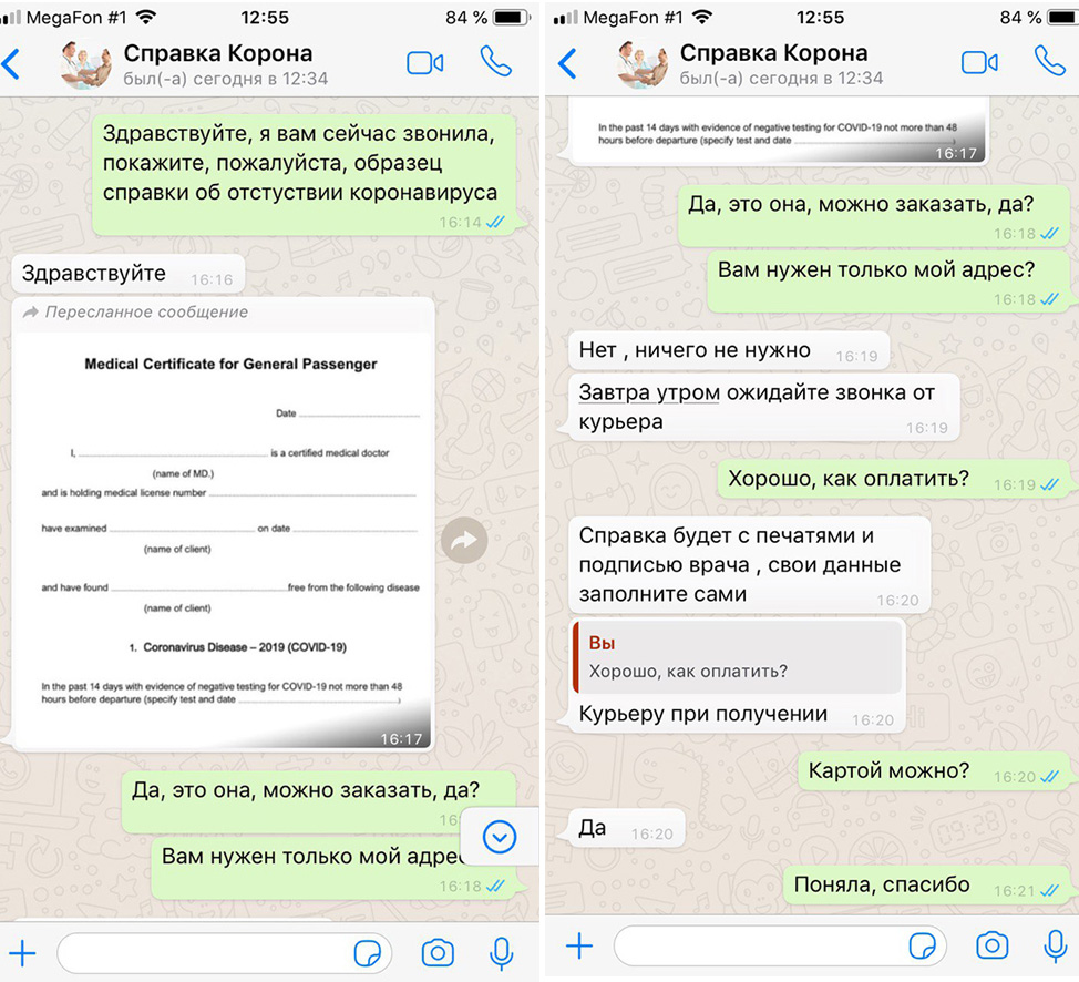 Мне перезвонил молодой человек, представился Владиславом, уточнил, нахожусь ли я в Москве и какая справка мне нужна, после чего попросил несколько минут для уточнения информации. После перерыва выяснилось, что Владислав может предоставить только справку об отсутствии контакта с инфекционными больными. Стоимость справки упала с пяти тысяч до 800 рублей, ценность же ее для туристов упала до нуля — такой сертификат ничем не поможет при пересечении границы. Пришлось отказаться от услуг этичного и нелюбопытного сервиса c бесплатным курьером.