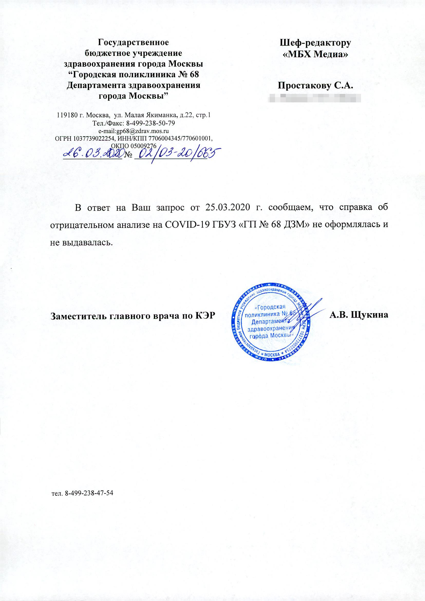 (Обновлено 18.10 26.03.2020) Администрация городской поликлиники №68 прислала ответ на официальный запрос. Ни на один из заданных мной вопросов, например, о том, какие санкции будут применены к врачу, выдавшему поддельную справку, администрация не ответила, ограничившись сообщением, что такая справка в поликлинике не оформлялась и не выдавалась.
