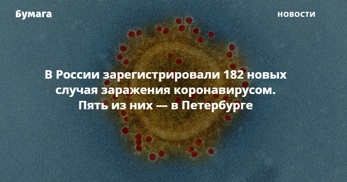 В России зарегистрировали 182 случая заражения коронавирусом нового типа. Пять из них — в Петербурге, сообщает оперативный штаб по профилактике распространения инфекции.