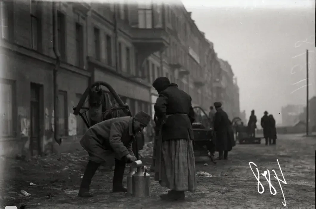 Факты.Удивительно: на Невском всегда было не протолкнуться! Поразила фотография, года 1914-го, снятая из ателье Карла Буллы: там настоящая пробка из экипажей извозчиков, а еще конки, толпы пешеходов! И контраст: фото времен Гражданской войны, 1918–1921 годы, Клинский проспект, мои родные места: женщина покупает молоко.