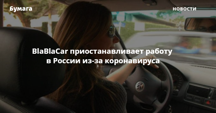 Сервис по поиску попутчиков BlaBlaCar временно приостанавливает работу в России из-за распространения коронавирусной инфекции. Об этом «Бумаге» сообщили представители компании.