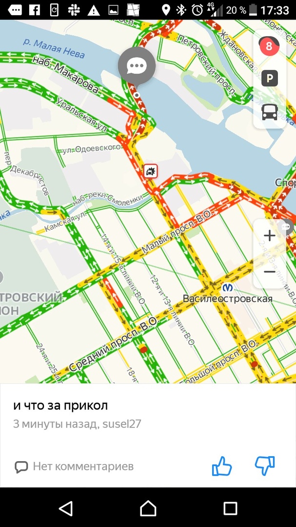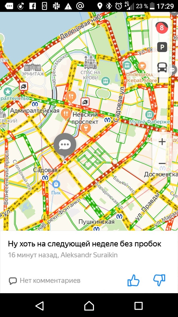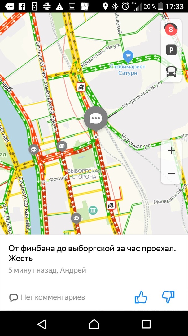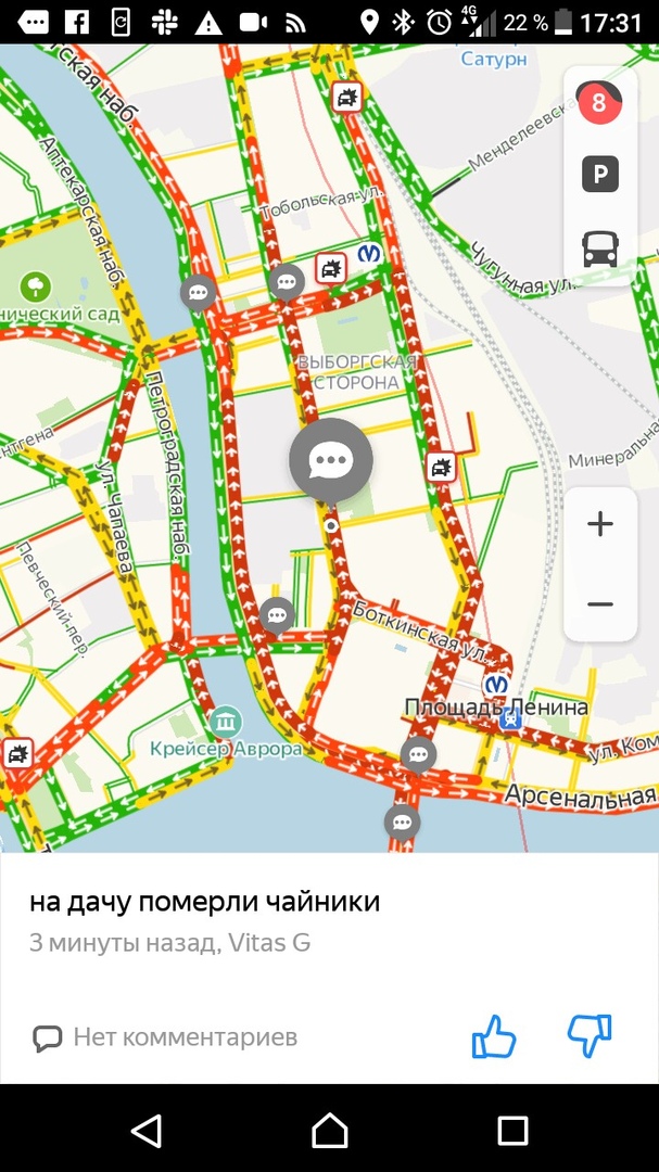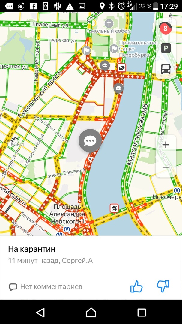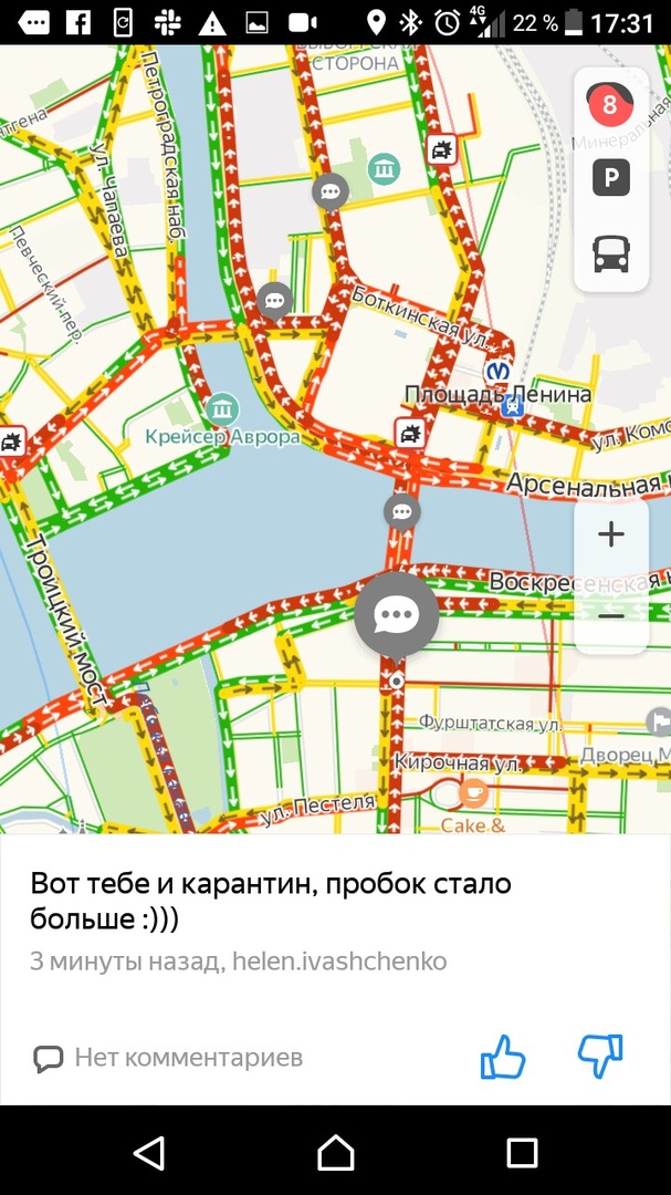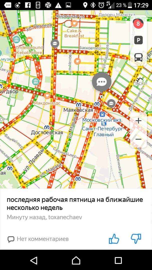 Вечером 27 марта, в последний рабочий день перед началом «путинских каникул», на дорогах Петербурга образовались восьмибалльные пробки. Движение затруднено в центре, на Петроградской стороне и на выезде из города.