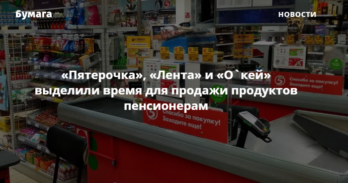 Сети торговых магазинов «Пятерочка», «Лента» и «О`кей» выделили определенные часы, когда будут принимать и обслуживать пенсионеров в приоритетном порядке. Решение принято для борьбы с коронавирусной инфекцией, особо опасной для пожилых людей. Об этом представители сетей рассказали в соцсетях.