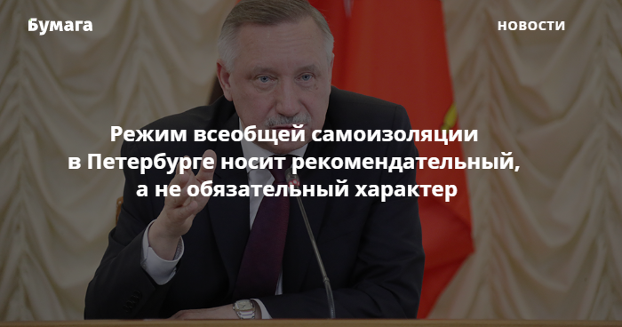 Губернатор Петербурга Александр Беглов рекомендовал горожанам полностью самоизолироваться и не выходить из домов без необходимости, а не обязал их делать это. Об этом объявило правительство города.