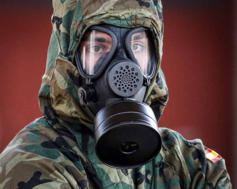 Испанский военнослужащий во время дезинфекции железнодорожной станции. Ирун, Испания. 28 марта 2020 Фото: Javier Etxezarreta / EPA / TASS