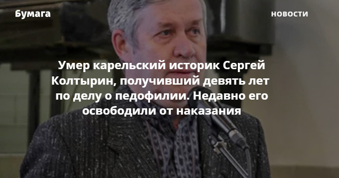 Умер бывший глава краеведческого музея в Медвежьегорске Сергей Колтырин, осужденный на девять лет колонии по обвинению в педофилии. Об этом сообщает «Дождь» со ссылкой на правозащитный центр «Мемориал».