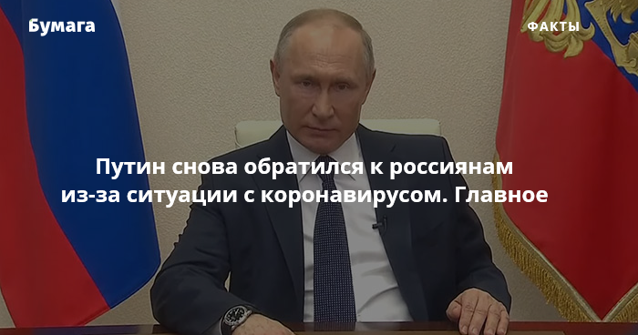 Днем 2 апреля Владимир Путин во второй раз обратился к россиянам из-за ситуации с коронавирусом. Он продлил нерабочий период до конца апреля и позволил администрациям регионов самостоятельно выбирать ограничительные меры. «Бумага» публикует главное из речи президента.