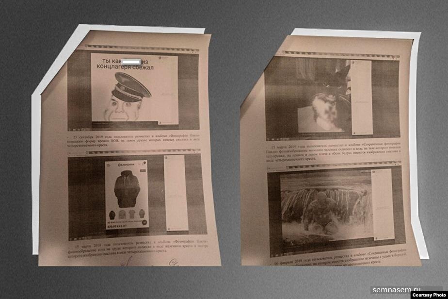 На фото были Чарльз Мэнсон с вытатуированной свастикой на лбу, свастика из кетчупа, кот с нацистским орденом на шее и мем с санитаром в фуражке Вермахта. В протоколе это описывается как изображение четырехконечного креста и "нацистская свастика в виде черепа, являющаяся символом мертвая голова". Селезнев не смог объяснить, что значит формулировка в протоколе, назвав их неграмотными.