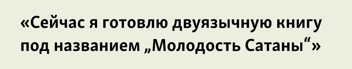Я лет пятнадцать не писал по-русски, но последние два-три года опять начал, чтобы не забыть язык. Сейчас я готовлю двуязычную книгу под названием «Молодость Сатаны». Это, как всегда, очень автобиографично и очень лично. Один из моих текстов называется «Беc любви в меня залез» (смеется). Это постоянная тема и в моем искусстве, и в моих стихах, и в журналистике.