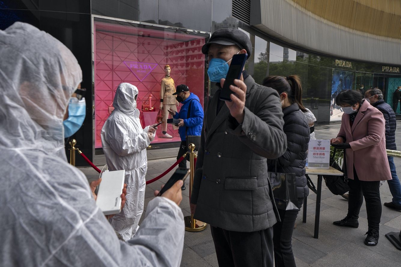 Fei Maohua / Xinhua / AP / Scanpix / LETA Проверка «цветного кода» у работников супермаркета в Китае. 30 марта 2020 года