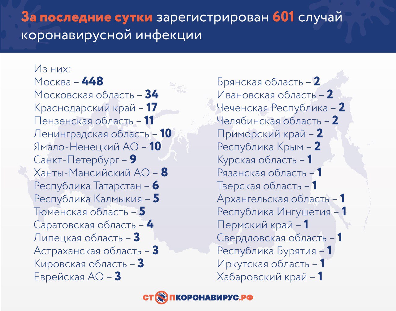 В России выявили 601 случай заражения коронавирусом