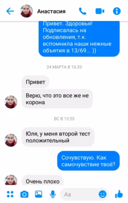 Последняя запись в ее фейсбуке датирована этим же днем. 26 марта в 13:13 она написала: "Первый тест на корону – отрицательный". Под тем же постом можно прочитать комментарий, датированный 29 марта. У нее спрашивают, как тест на коронавирус, она отвечает, что он отрицательный. А на вопрос, почему она не объявляет об этом, Анастасия отвечает, что ей трудно писать, а температура держится.