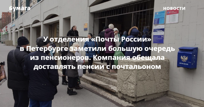 «Почта России» же ранее сообщала, что на время распространения коронавируса, который наиболее опасен для людей пенсионного возраста, пенсии россиянам будут поквартирно доставлять почтальоны. В компании утверждали, что к концу марта лишь 8 % клиентов «Почты России» приходят за пенсиями лично. В пресс-службе «Почты России» не смогли оперативно ответить на звонок «Бумаги».