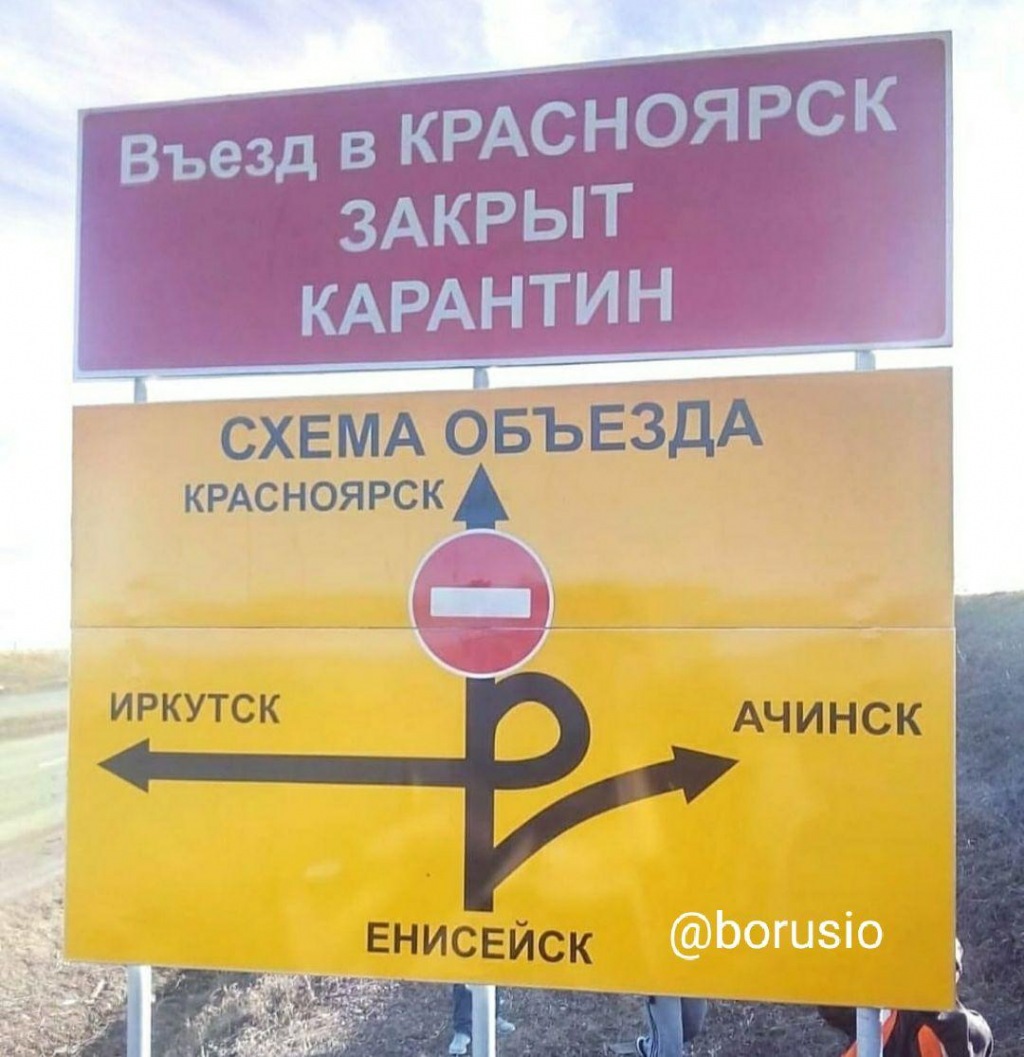 Фотографию еще одного объявления опубликовал телеграм-канал «Борус». Та же надпись о карантине сопровождается «схемой объезда», на которой показано, что въезд в Красноярск заблокирован. В то же время начальник пресс-службы губернатора Максим Кудрявцев решил заявить, что «этих знаков в настоящее время нигде нет. Ни на одном въезде в город».