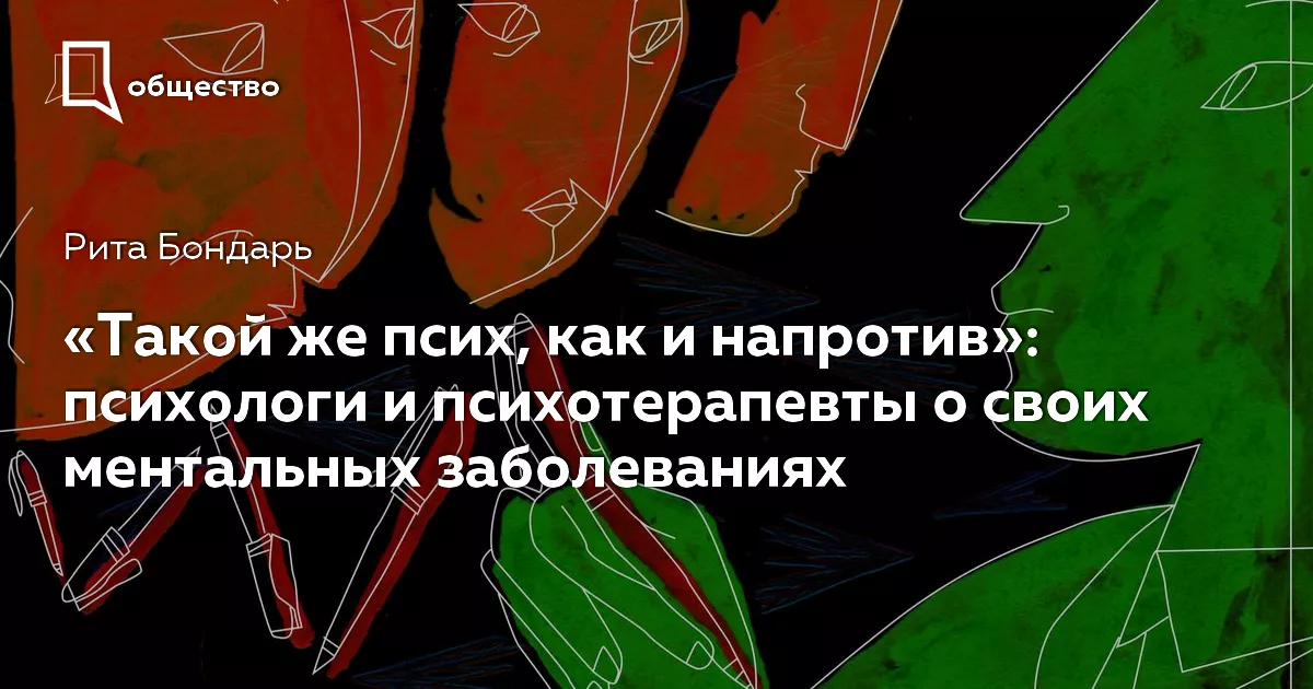 Представьте, что сидите на приеме у терапевта. Задумываетесь ли вы, что происходит у него в голове в это время? Поел ли он с утра, хорошо ли выспался, какое у него сегодня настроение? Внутренний мир специалистов, занимающихся психическим здоровьем, тщательно скрыт от глаз клиентов — таковы традиционные установки в профессиональной среде. Может, ваш психиатр или психолог сам живёт с хроническим психическим расстройством, находится в депрессии или имел травматический опыт? Дружественные отношения с клиентами находятся под запретом, любое проявление чувств — строгое табу. Разбираемся, как справляются с проблемами люди, чья работа — помогать другим жить и чувствовать себя хорошо.