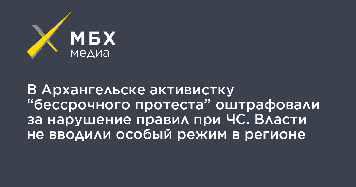 Октябрьский районный суд Архангельска оштрафовал активистку «бессрочного протеста» на 3 тысячи рублей по статье о невыполнении правил поведения при чрезвычайной ситуации ии угрозе ее возникновения — 20.6.1 КоАП. Об этом сообщает «Северо-Запад. МБХ медиа» со ссылкой на юриста Оксану Владыку.
