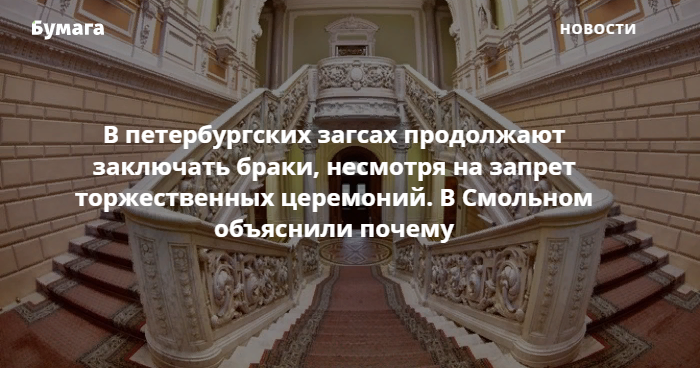 В комитете по делам записи актов гражданского состояния «Бумаге» сообщили, что до 30 апреля государственная регистрация брака в Петербурге действительно приостановлена. Тем не менее в «исключительных» случаях, когда дату регистрации невозможно изменить, ее производят в неторжественной обстановке. В зал не допускают никого, кроме брачующихся.