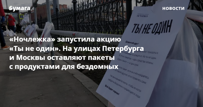 «Ночлежка» запустила акцию «Ты не один», в ходе которой сотрудники фонда разложили 120 наборов с предметами первой необходимости на улицах Петербурга и Москвы.