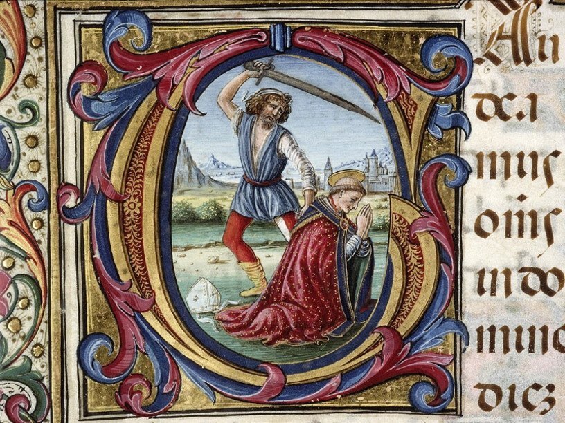 Томас Бекет был близким другом английского короля Генриха II и занимал при нем пост канцлера, а в 1161 году стал архиепископом Кентерберийским. Но с этого момента между королем и Томасом Бекетом начал развиваться конфликт. Сначала Бекет противился планам короля распространить юрисдикцию королевских судов на церковные земли, затем выступил против желания Генриха II короновать своего сына в качестве соправителя. Четверо преданных королю рыцарей решили убить Томаса Бекета и 29 декабря 1170 года осуществили задуманное. Подробности этой истории можно узнать из отдельного очерка.