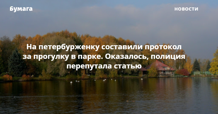 На петербурженку составили административный протокол за посещение Приморского парка Победы, однако суд установил, что полицейские перепутали статью. Об этом сообщает пресс-служба судов Петербурга.