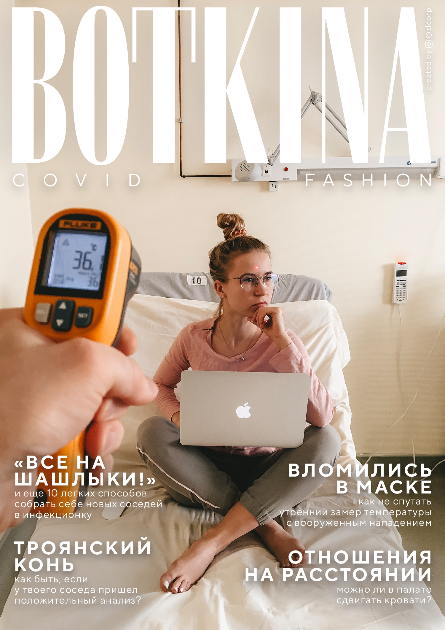 Как-то он сфотографировал в боксе свою девушку и решил, что снимок хорошо смотрелся бы на обложке. Так он придумал вымышленный глянцевый журнал Botkina Covid Fashion и сверстал обложку с заголовками про жизнь в больнице.