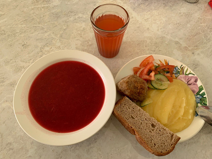 Еду приносят три раза в день. Около 8:30 завтрак, в 13:30 — обед, в 17:30 — ужин. У всех пациентов в палате также несколько литров свежей воды.