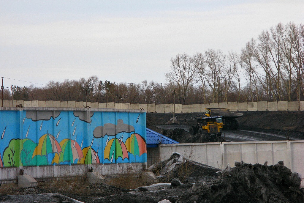 А, может, оно самое — это кусок бетонного забора, окрашенный в веселенькие цвета? Ну как минимум, это ярко и даже как-то жизнерадостно посреди серой пустыни — ведь за забором яма. Та самая, что давно стала брендом города — Киселевску вообще на такие мрачные символы везет. Здесь на месте старых шахт ведут добычу два предприятия — «Участок Коксовый» и «Шахта №12».