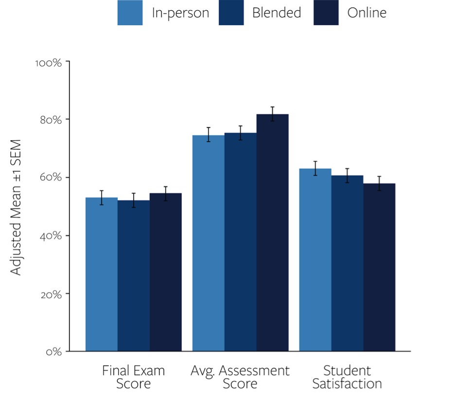 Исследователи отметили, что студенты, которые проходили курс в онлайн-формате, были чуть менее удовлетворены процессом обучения. Это связано с отсутствием опыта и навыков обучения в онлайн-среде, в первую очередь тайм-менеджмента.