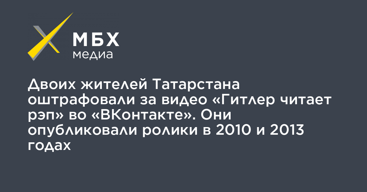 Сармановский районный суд Татарстана назначил штрафы по тысяче рублей местным жителям Радику Фатихову и Айнуру Газизуллину за опубликованные во «ВКонтакте» видео «Гитлер читает рэп». Соответствующие постановления (1,2) «МБХ медиа» обнаружило в базе суда.