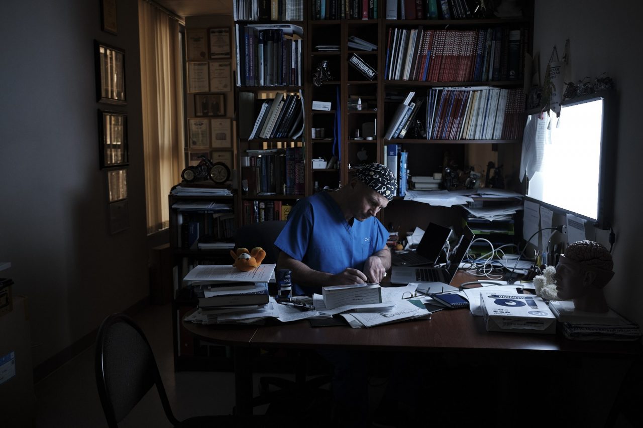 Нейрохирург Юрий Кушель в своем кабинете в Национальном медицинском исследовательском центре нейрохирургии имени Н. Н. БурденкоФото: Василий Колотилов для ТД — Тем не менее люди едут лечиться за рубеж. И часто им помогают в этом серьезные благотворительные фонды.