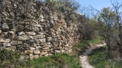 Приходится обходить по восточному склону, благо есть хорошо протоптанная тропинка. Здесь подпорная стена, выложенная из «дикого» камня всухую, заросли ежевики и других кустарников.
