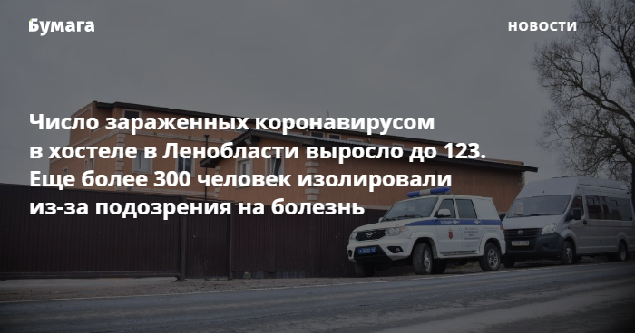 Утром 15 апреля федеральный оперштаб подтвердил заражение коронавирусом у 88 постояльцев нелегального хостела в деревне Новосергиевка в Ленобласти. Общее число зараженных выросло до 123, подтвердили «Бумаге» в пресс-службе правительства региона.