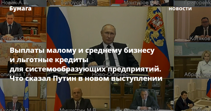 Владимир Путин 15 апреля провел совещание с членами правительства. Перед ним он озвучил новые меры по поддержке бизнеса в условиях пандемии коронавируса. «Бумага» собрала главные тезисы из выступления президента.